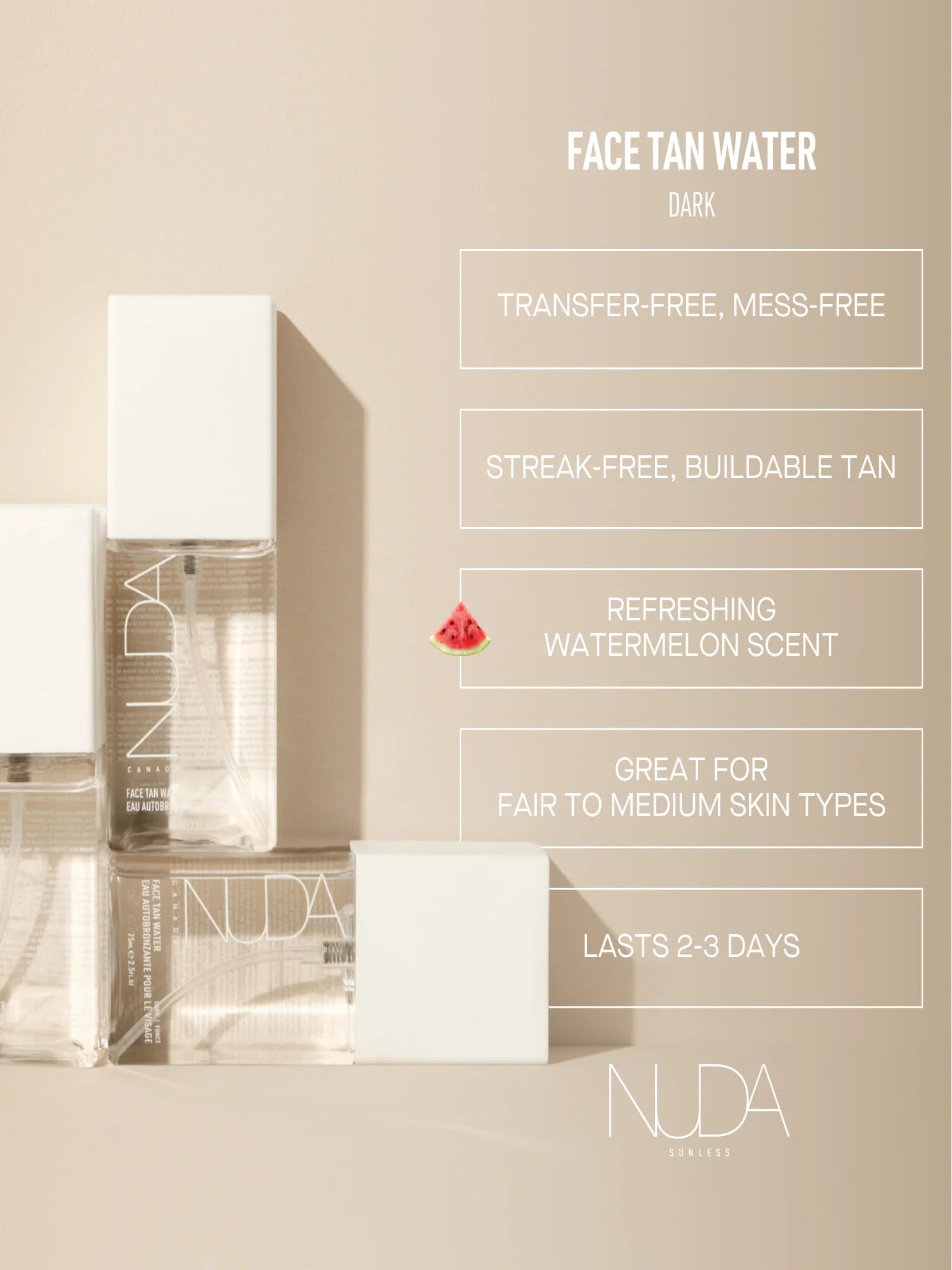 Face Tan Water is a clear, lightweight, non-sticky face tan water. Enriched with Aloe Vera, White Tea Extract, and Cucumber Extract, this hydrating self-tanner soothes and nourishes the skin. This skin-loving formula delivers a natural-looking deeper glow within 6 hours. Use this product to boost your glow 3-4 times a week, place under your skincare routine or on top of a moisturizer. The transfer-free, seamless MicroMist ensures a mess-free application, while its refreshing watermelon-scented formula offers a non-irritating radiant glow. Simply spritz, wait, rinse, and reveal your radiance!